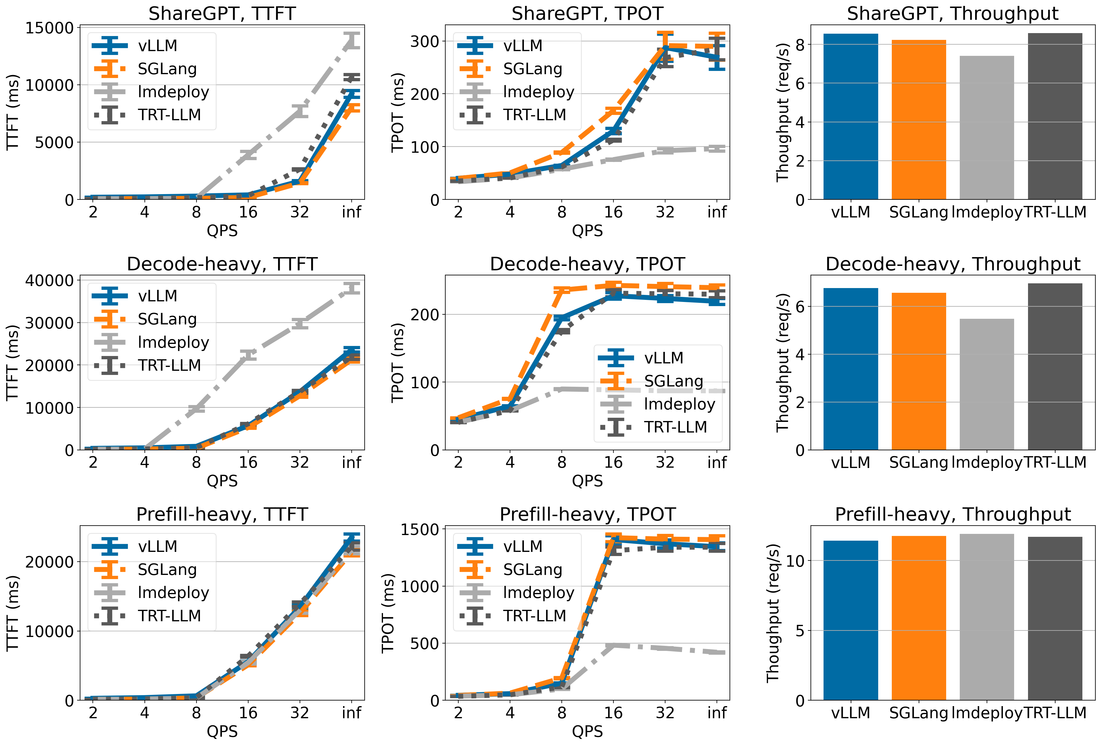For the rest of performance benchmarks, as well as captured detailed metrics for time-to-first-token (TTFT) and time-per-output-token (TPOT), please refer to the appendix for more data and analysis. You can follow this github issue to reproduce our benchmark.